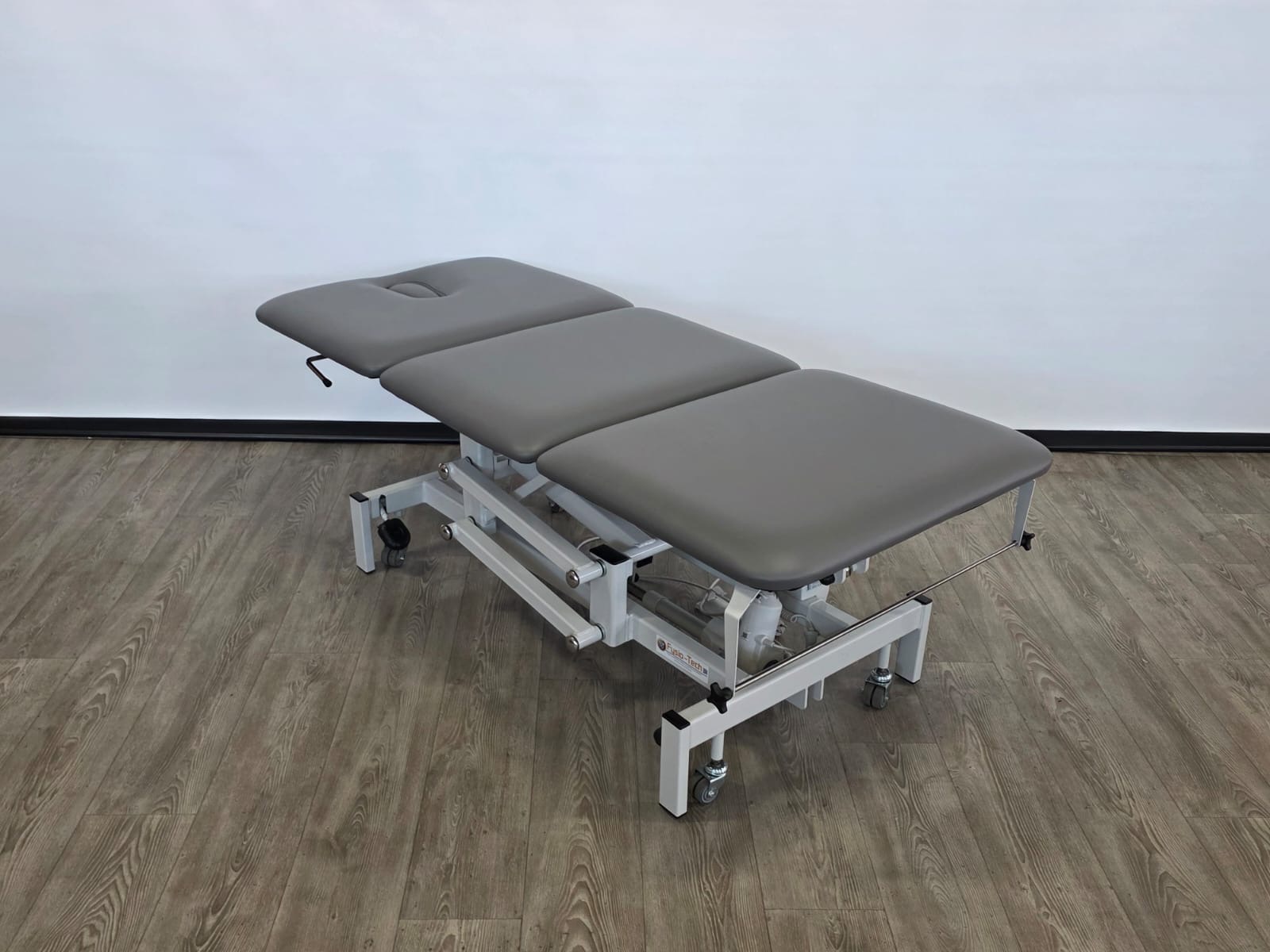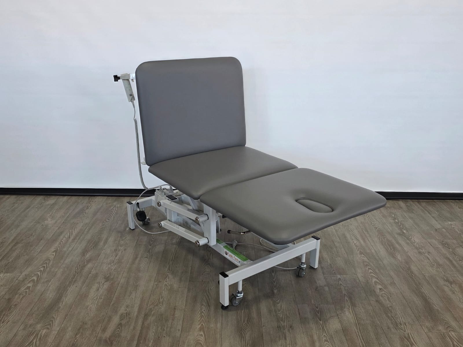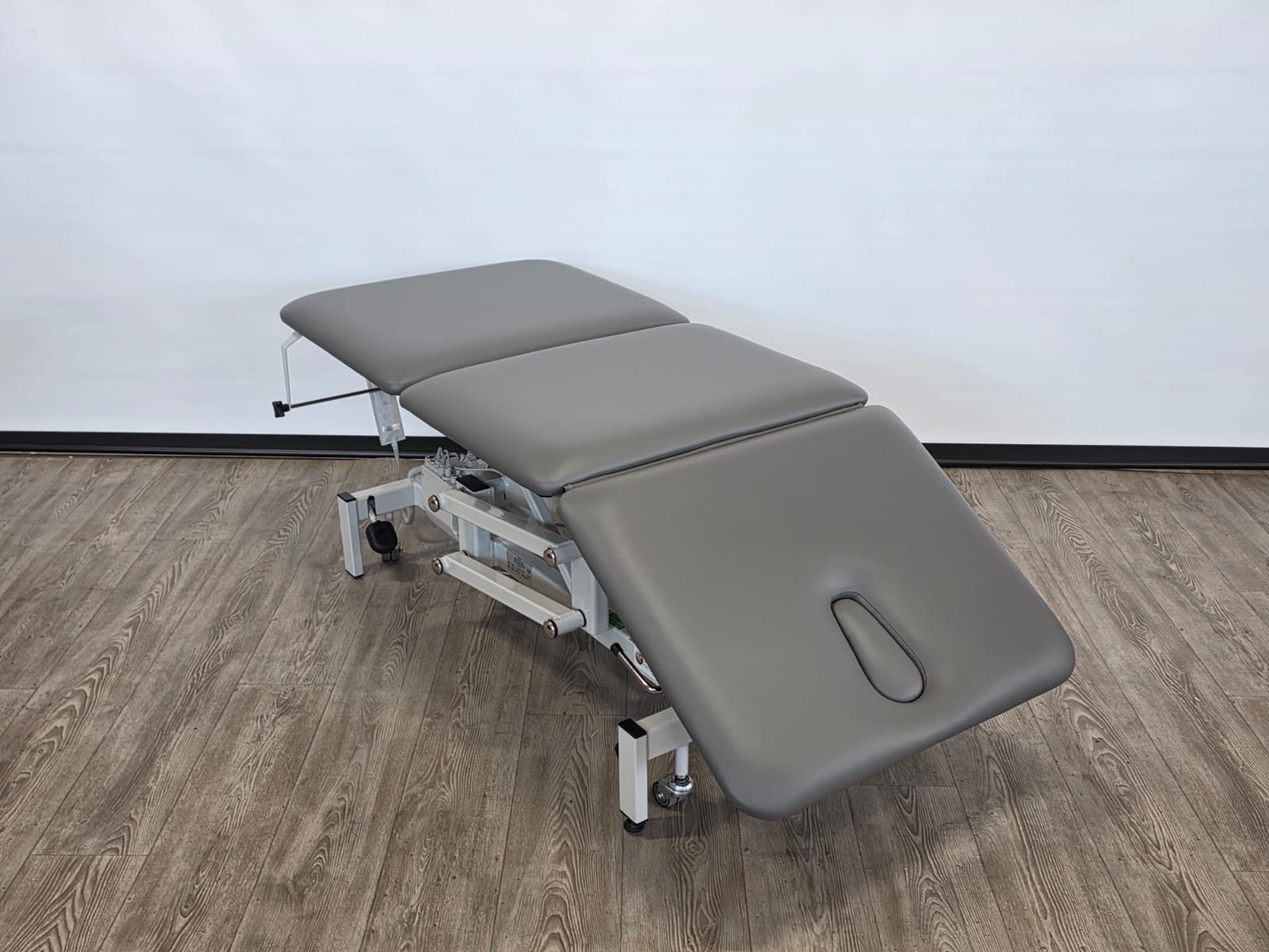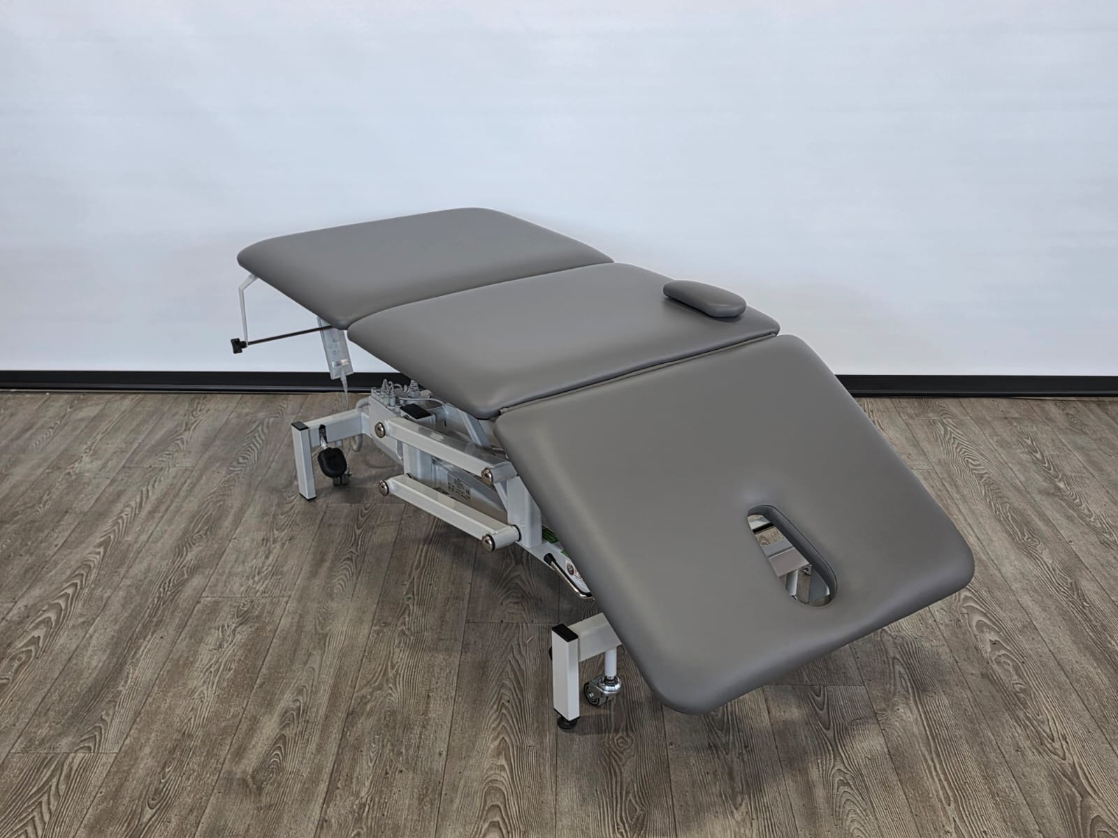 Deze behandeltafel is elektrisch in hoogte verstelbaar door middel van handschakelaar. Door een tweede motor is het hoofddeel ook elektrisch verstelbaar.