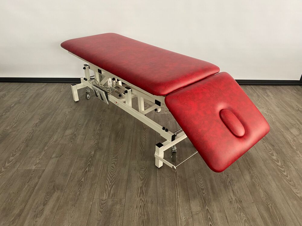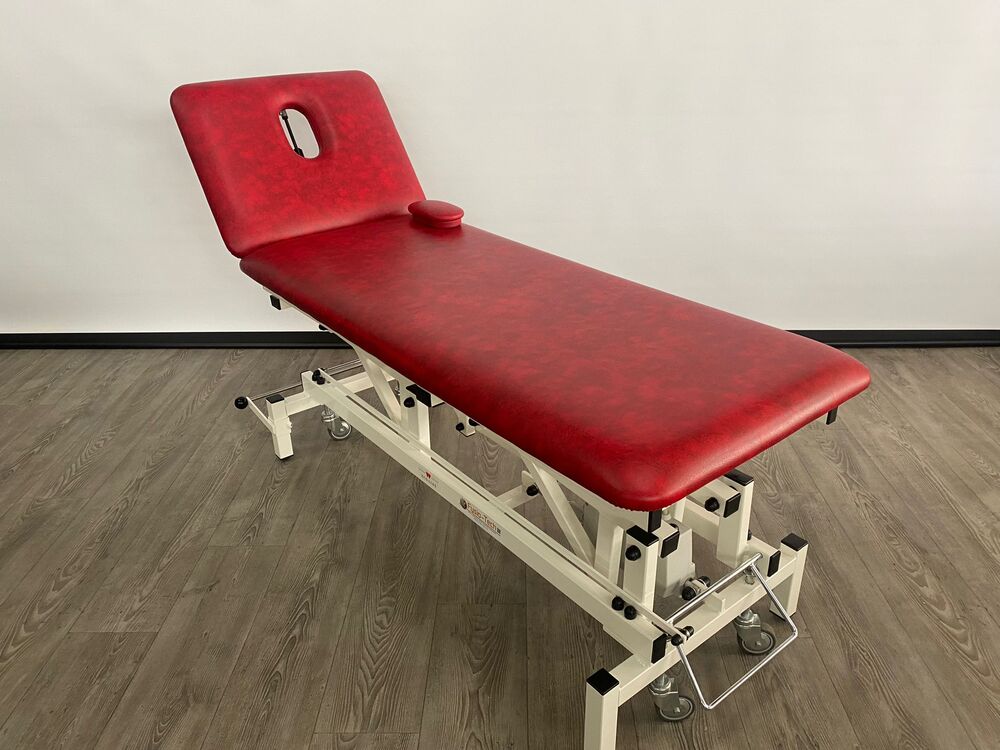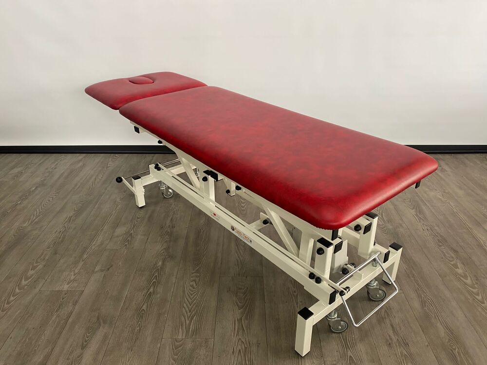 Deze professionele behandeltafel is elektrisch in hoogte verstelbaar doormiddel van een voetschakelaar.